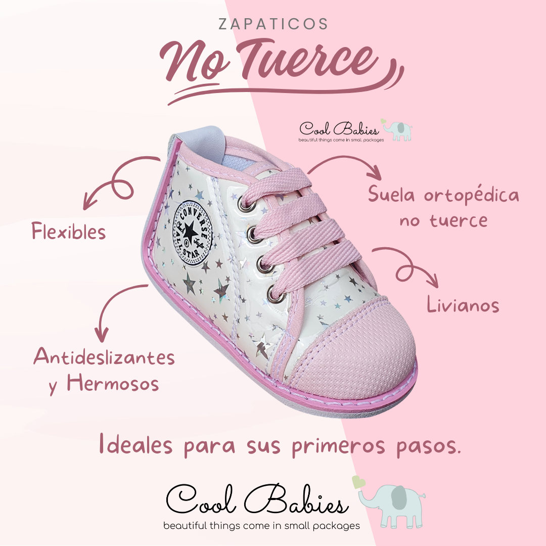 Su diseño en color blanco y rosado, con capellada de delicado estampado de estrellas plateadas, aporta ternura y estilo a cada look, combinando fácilmente con cualquier outfit, desde prendas sport hasta los looks más coquetos. Un modelo práctico, cómodo y con el sello premium de Cool Babies.