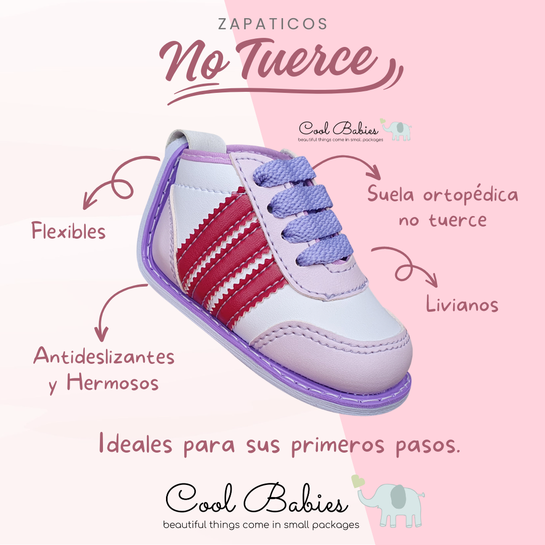 Zapaticos No Tuerce, diseñados con los mejores materiales para apoyar los primeros pasos de tu pequeña. Su suela flexible y antideslizante ofrece seguridad al caminar, mientras que su divertido diseño se combina fácilmente con cualquier outfit.